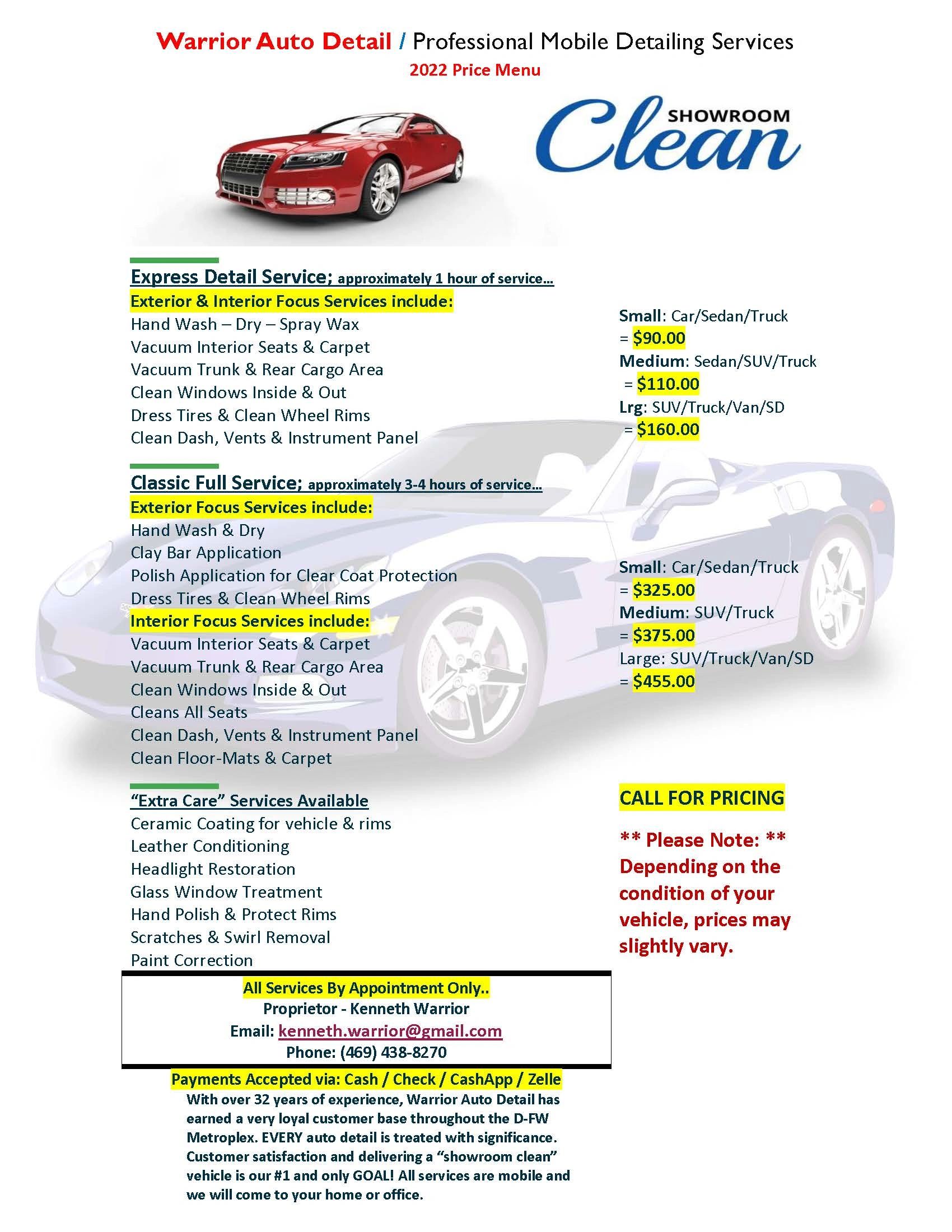 No appointments required EVER. The size and condition of your vehicle and which services you want all come into play. 2022 Detailing Price List.